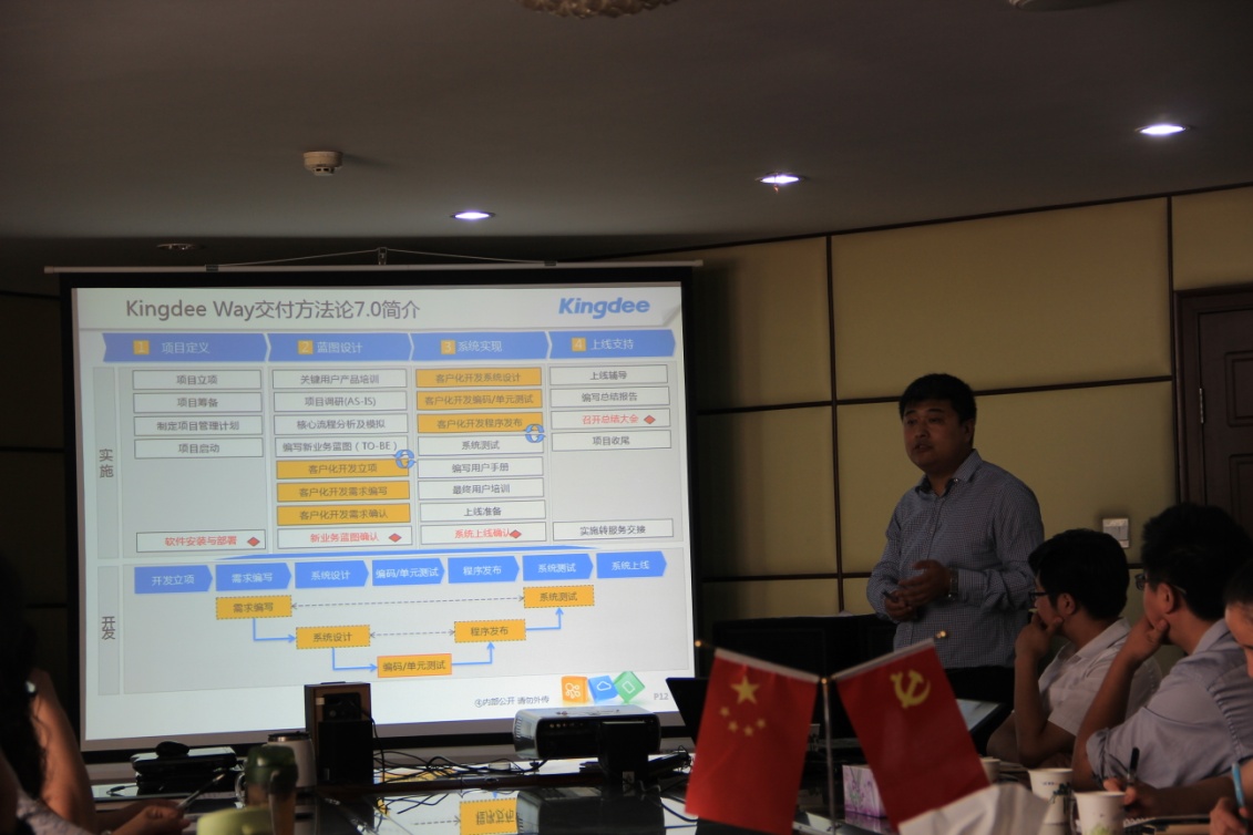 通過會議溝通,雙方共同確立了實施的相關事項、確定了各項目小組成員,金蝶方項目總監(jiān)做了“項目實施方案”和“金蝶實施方法論”的主題講解。