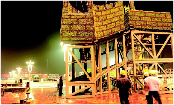 在景觀花壇的運輸及安裝過程中,為確保按時限要求,在8月11日夜間順利完成鋼結(jié)構(gòu)件的轉(zhuǎn)場作業(yè),首建集團精心準(zhǔn)備,先后進行了三次線路勘察,并把車輛高度嚴(yán)格控制在4.65米范圍內(nèi),確保符合沿途路橋的通過極限要求。8月11日晚8點半,滿載著景觀花壇鋼結(jié)構(gòu)構(gòu)件的十四輛大型拖車從西集出發(fā),經(jīng)過近4個小時的行程,平穩(wěn)地陸續(xù)駛?cè)胩彀查T廣場內(nèi)的指定位置,在專業(yè)人員的引導(dǎo)下,進入鋪設(shè)好竹膠板和枕木墊塊的花壇擺放核心區(qū)域。隨后,在清脆的指揮哨音中,操作人員按照事先預(yù)定的施工方案,分頭完成構(gòu)件掛鉤、調(diào)整構(gòu)件姿態(tài)、找構(gòu)件碼放位置、解鉤等一系列動作。8月12日0點54分,第一鉤花壇底座平穩(wěn)落地。到早晨6點50分,這組花壇19塊鋼結(jié)構(gòu)中最后的兩塊被平穩(wěn)地吊裝到位,順利完工。