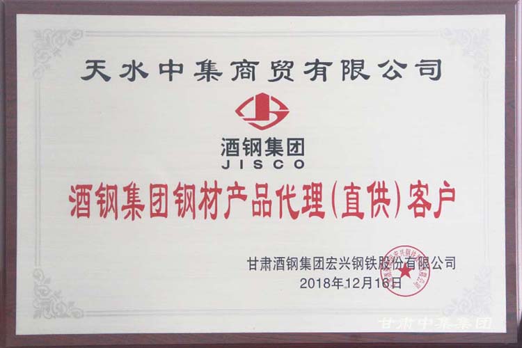 2018年12月12日,甘肅中集實(shí)業(yè)集團(tuán)有限公司及下屬子公司蘭州中集商貿(mào)有限公司、天水中集商貿(mào)有限公司榮獲“酒鋼集團(tuán)鋼鐵產(chǎn)品代理(直供)客戶(hù)”及“2018年度金牌代理商”殊榮。